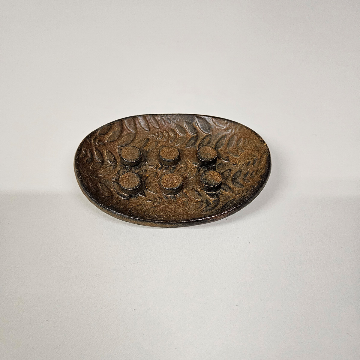 Ręcznie robiona mydelniczka kamionkowa. Wypalana w wysokich temperaturach, dzięki czemu szkliwienie jest trwałe i się nie ściera.